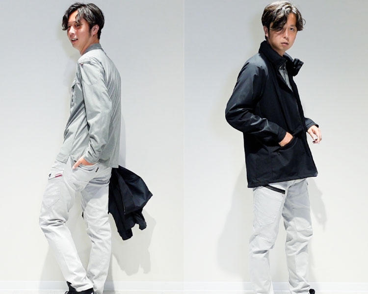上下のジャケット・パンツが「くすみカラー」なので、インナーは白いポロシャツにして抜け感を出したのもポイントです。 足元はスニーカー、革靴、作業用の安全靴など、何でも合わせられるコーディネートになっています。