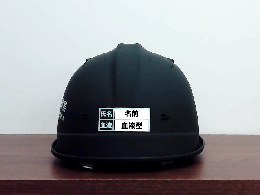 黒系ヘルメットの左面に大きめのオリジナルロゴを入れることで、社名がしっかり引き立っています。