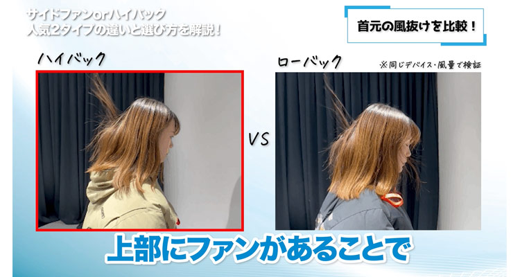 ローバックやサイドファンで、直接風が当たりすぎて腰やお腹が冷えてしまうという悩みも、ハイバックなら軽減できます。
