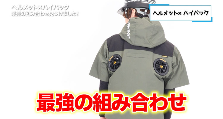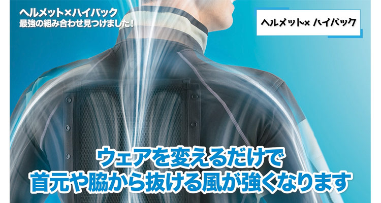 ハイバックの空調ウェアに加えて、さらに通気性に優れたヘルメットを合わせると効果は倍増します。