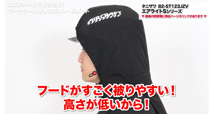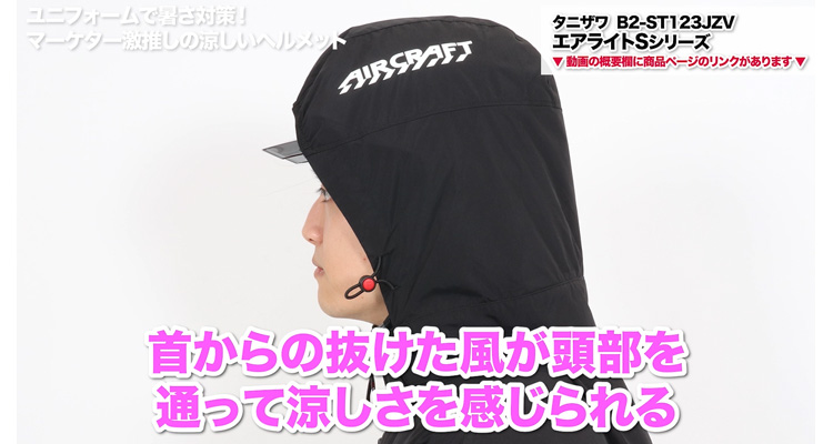空調ウェアのフードを被ると、首からの抜けた風が頭部を通ってより涼しさを感じられます。