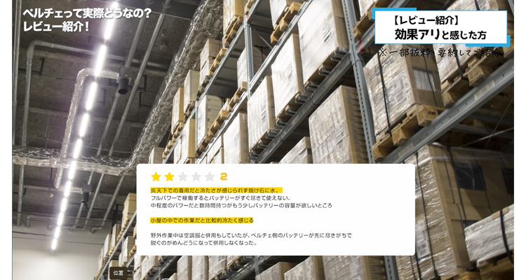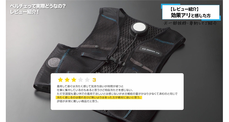 これらの感想をまとめると、ペルチェベストは使用する方の業種や環境によって、効果の感じ方が異なるとわかります。