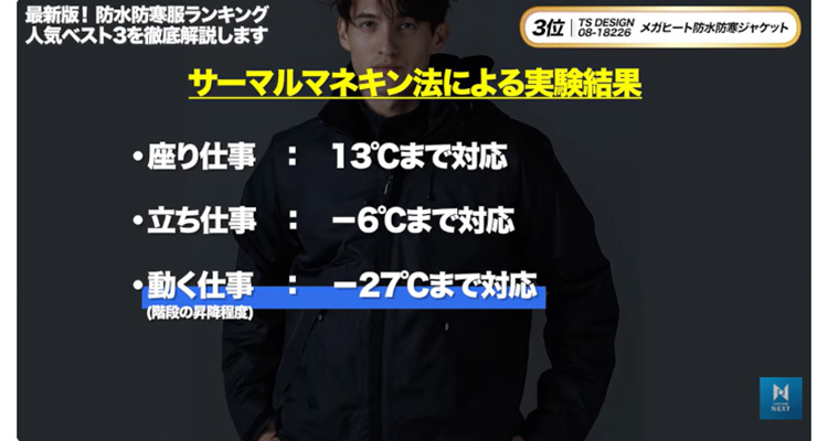 メーカーによるサーマルマネキン法の検証では、座り仕事では13度まで、立ち仕事ではマイナス6度まで、動き回る作業ではマイナス27度まで対応できるとされています。