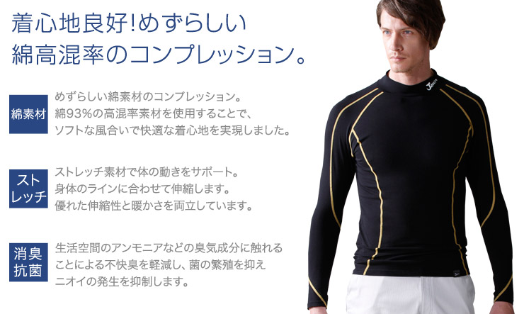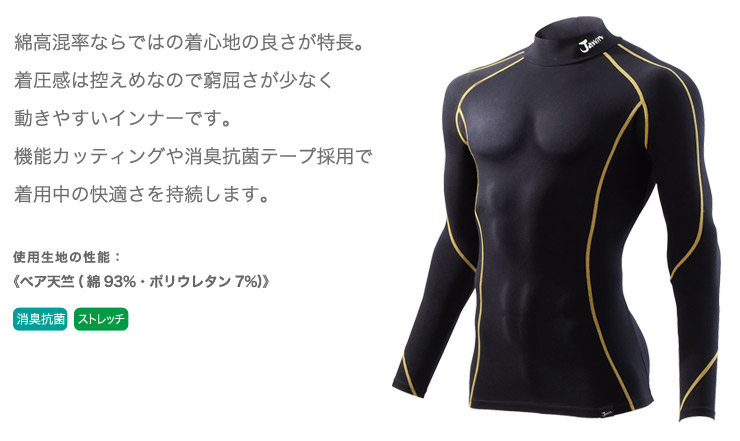 綿高混率でやわらかな着心地のコンプレッションインナー! 着心地にこだわり、着圧感はひかえめ、機能カッティングに消臭抗菌機能付きです。