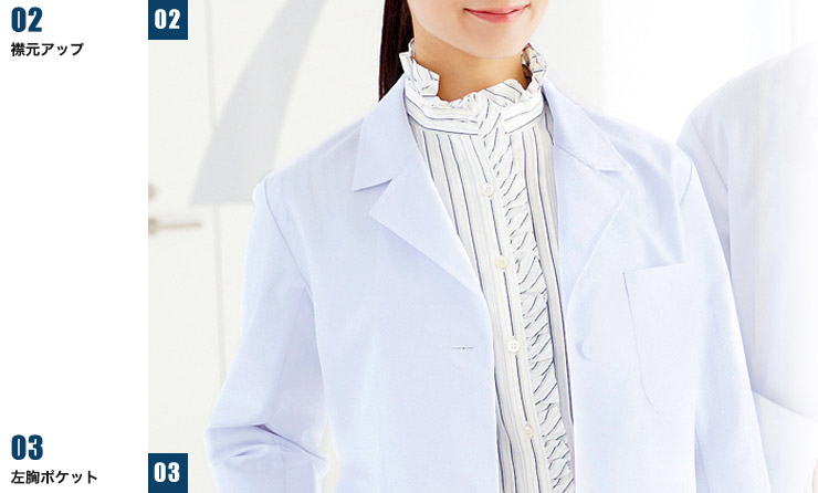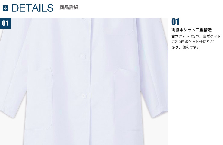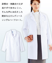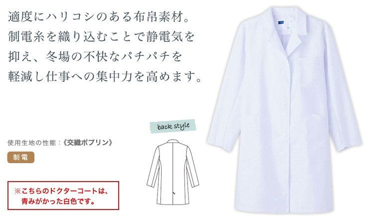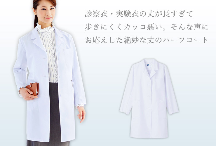 診察衣・実験衣の丈が長すぎて歩きにくい・カッコ悪い。 そんな声にお応えして、既存のロング丈より20cm短い絶妙な丈のレディースシングルハーフコート。 適度にハリコシのある布帛素材を使用しているため、制電糸を織り込むことで静電気を抑え、 冬場の不快なパチパチを軽減し仕事への集中力を高めます。