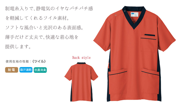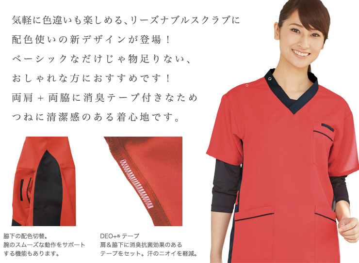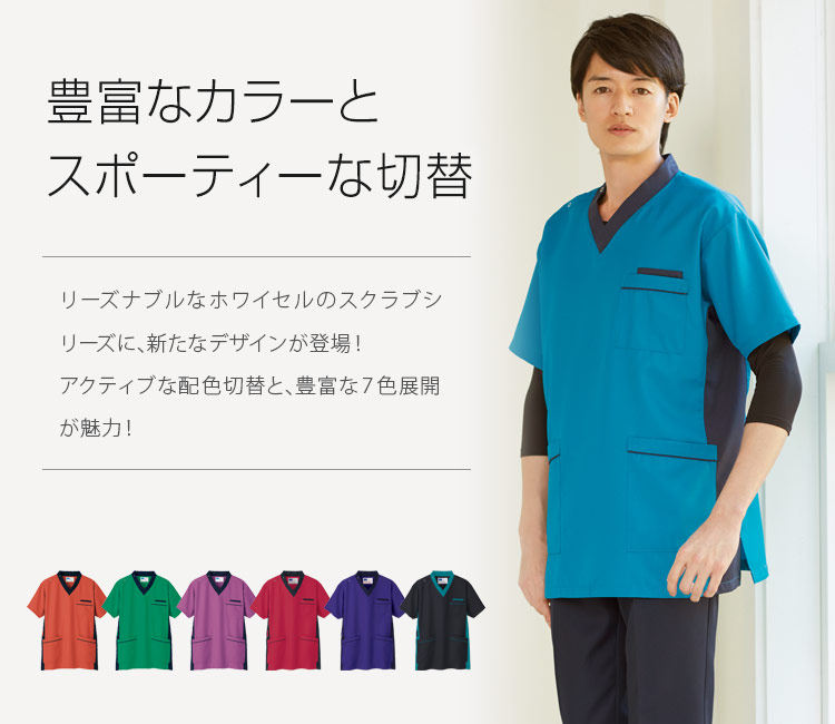リーズナブルなホワイセルのスクラブに、スポーティーなデザインスクラブが新登場! 豊富なカラーバリエーションと、医療現場に最適な機能を備えたスクラブ。 薄手で丈夫な素材は生地裏に制電素材を織り込んで、静電気を防止します。