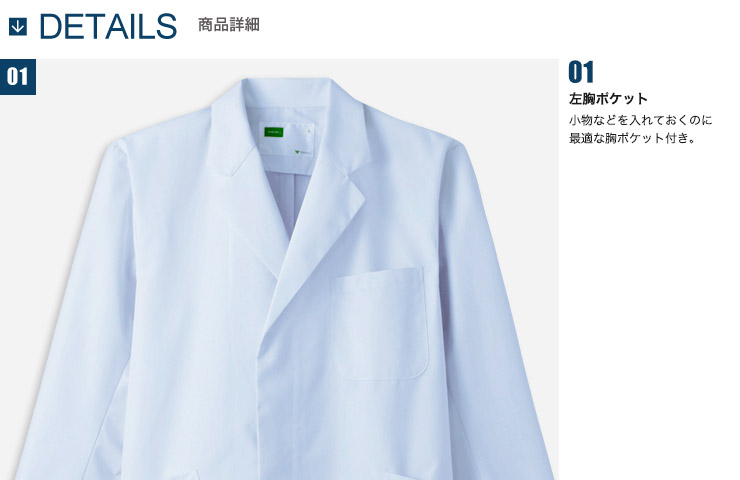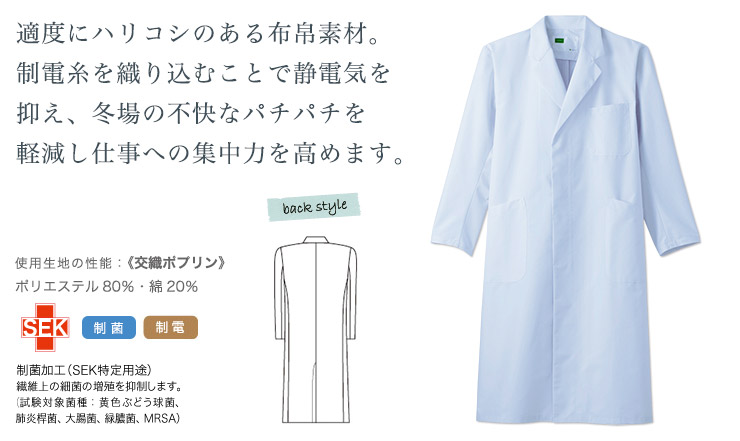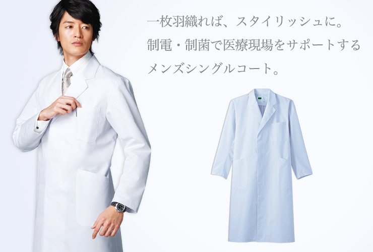制菌加工など医療現場に必要な機能を兼ね備えた男性用シングルコート。