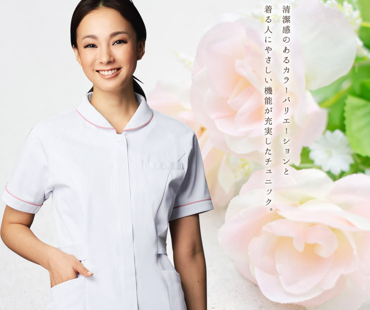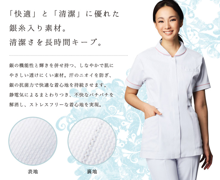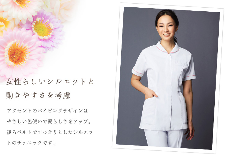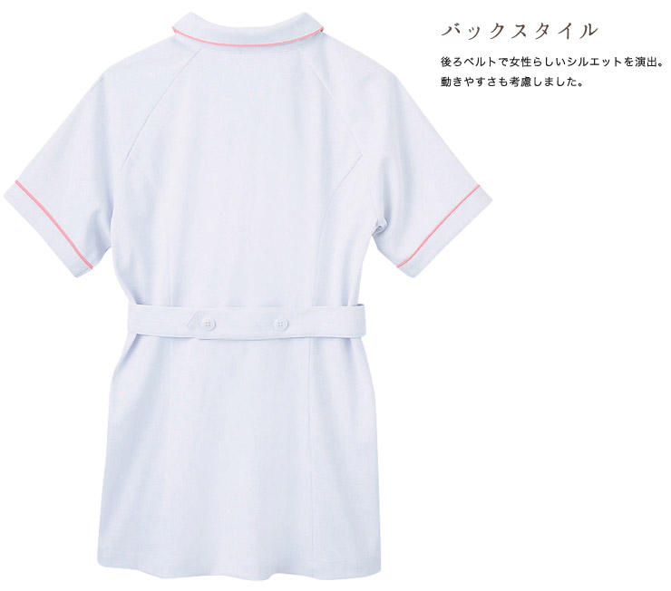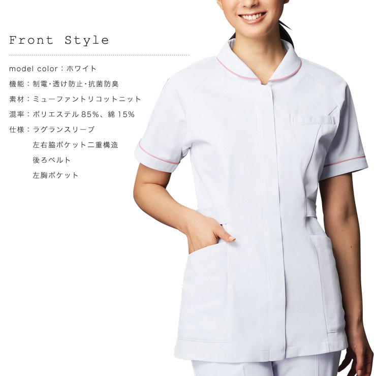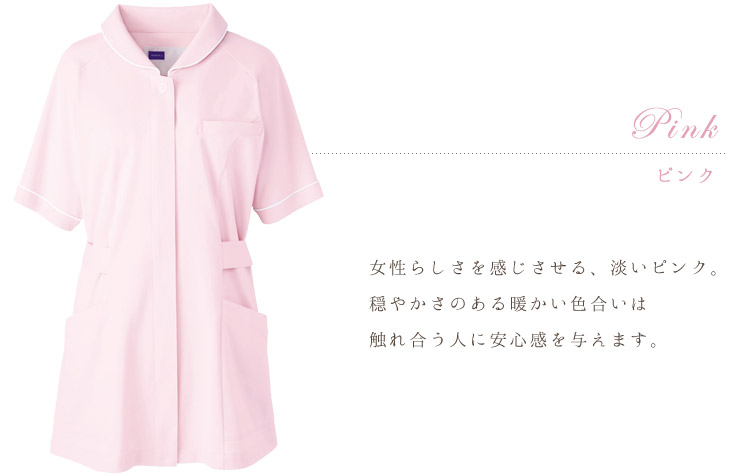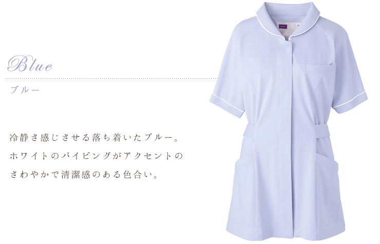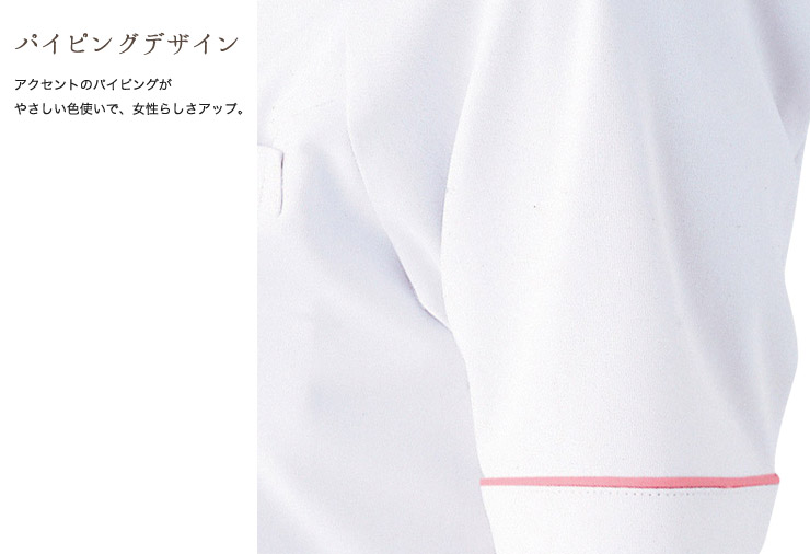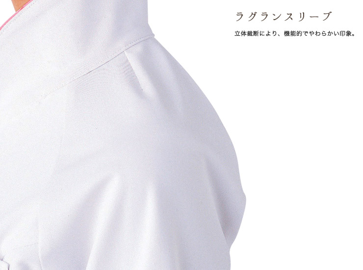 ほんのり愛らしい小さな衿とパイピングが女性らしさを演出し、ラグランスリーブで動きやすさも抜群。