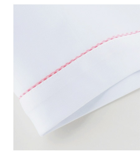 襟と袖口に入れたパステルカラーのギンガムチェックがさりげない甘口アクセント。