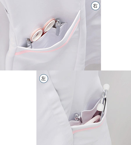 - 帯電防止素材、SEK制菌加工、透け防止、工業洗濯対応商品、二重ポケット、左胸ポケット
