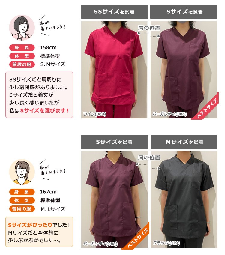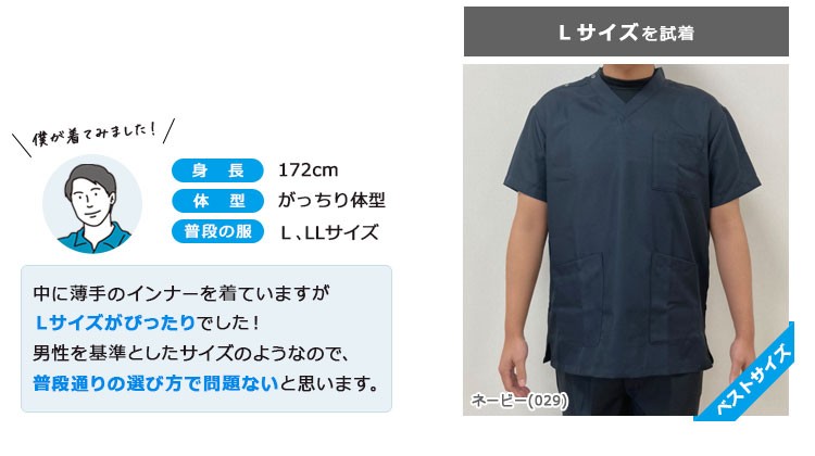 首の部分が少し開くので、中にインナーtシャツを着て、仕事しています。着用サイズは、ちょうどよいです。