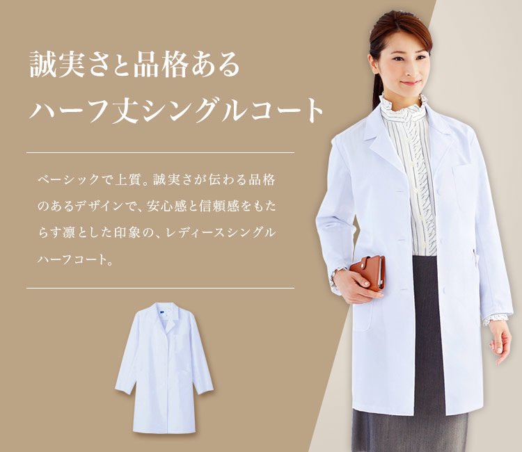 診察衣・実験衣の丈が長すぎて歩きにくい・カッコ悪い。 そんな声にお応えして、既存のロング丈より20cm短い絶妙な丈のレディースシングルハーフコート。 適度にハリコシのある布帛素材を使用しているため、制電糸を織り込むことで静電気を抑え、 冬場の不快なパチパチを軽減し仕事への集中力を高めます。
