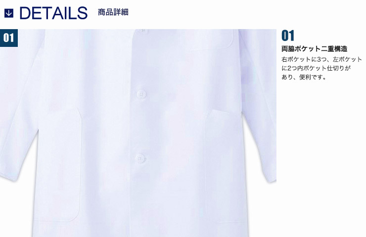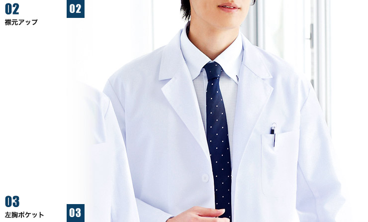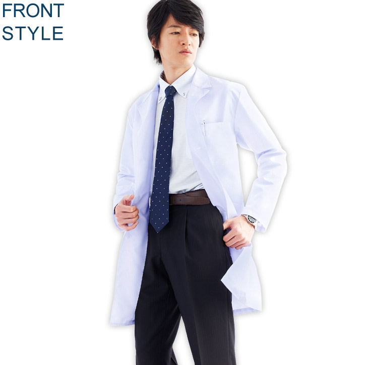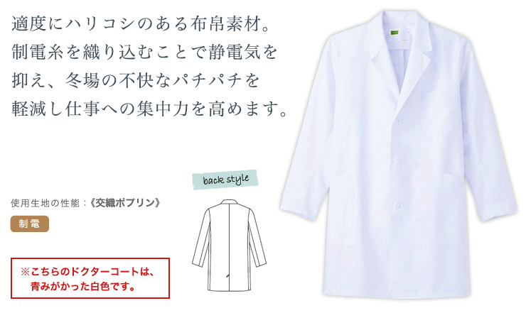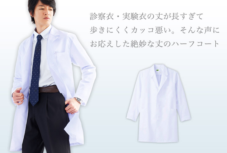 診察衣・実験衣の丈が長すぎて歩きにくい・カッコ悪い。 そんな声にお応えして、既存のロング丈より20cm短い絶妙な丈のメンズシングルハーフコート。 適度にハリコシのある布帛素材を使用しているため、制電糸を織り込むことで静電気を抑え、 冬場の不快なパチパチを軽減し仕事への集中力を高めます。