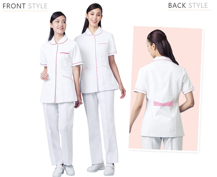チュニック、ワンピースにリボンモチーフの後身頃、ハートシェイプド・ネックや花びらモチーフの袖口、脇ポケットのデザインカットや女性が嬉しいデザインをプラス。視認性も意識したデザイン で、スタッフ間だけでなく、患者さんやご家族からも見つけやすく分かり易い配色使いを心掛けています。