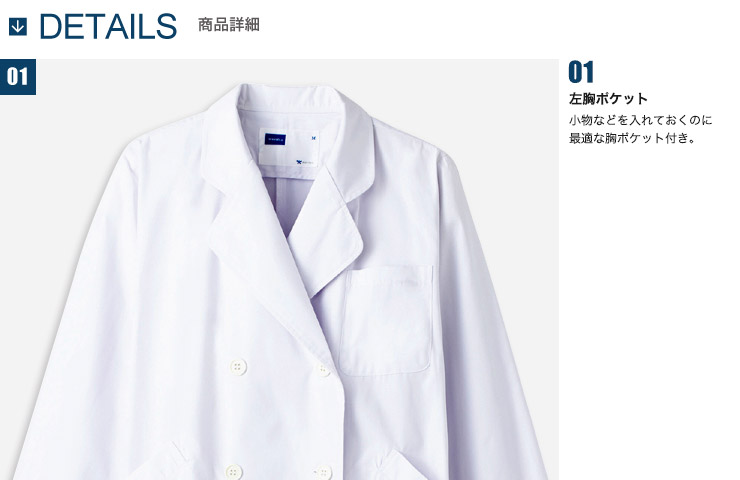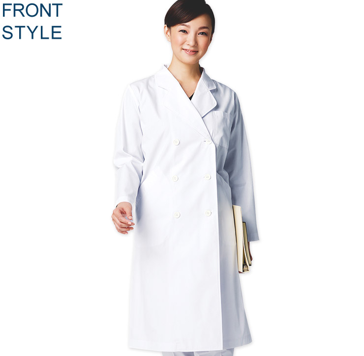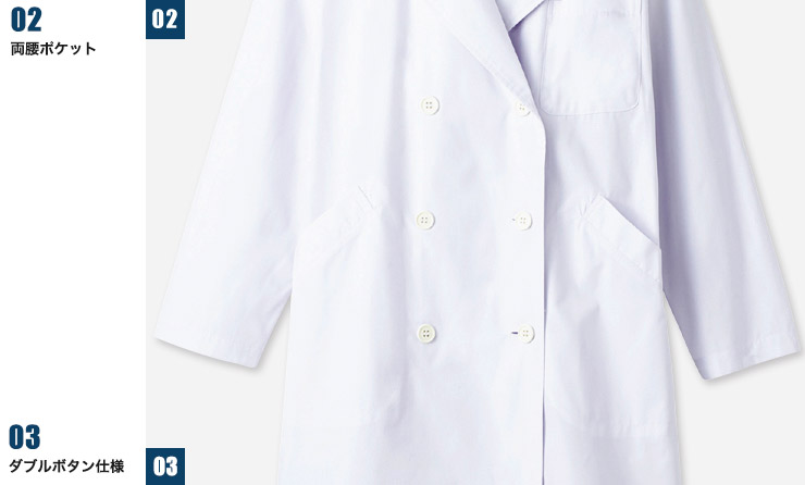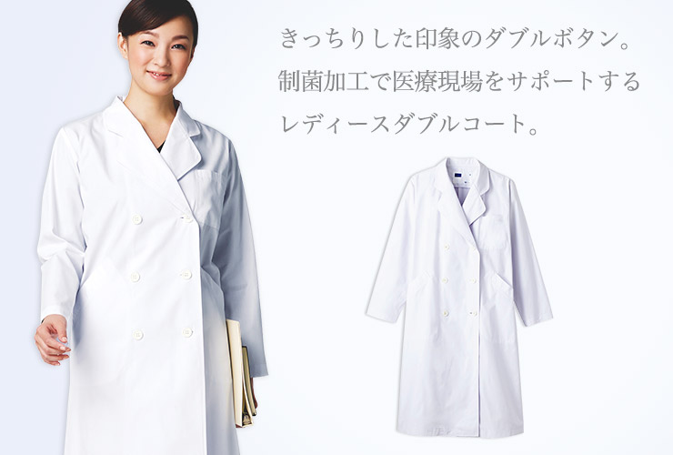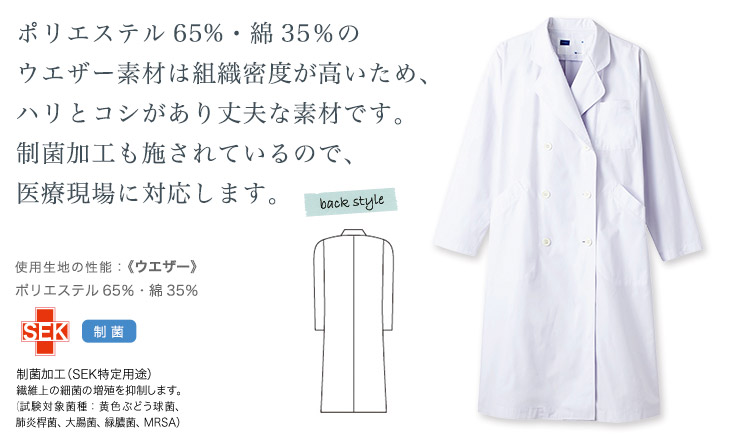 コシがあり丈夫なウエザー素材に制菌加工を施すことで、医療現場をサポート! ダブルボタン仕様できっちりした印象を与えます。