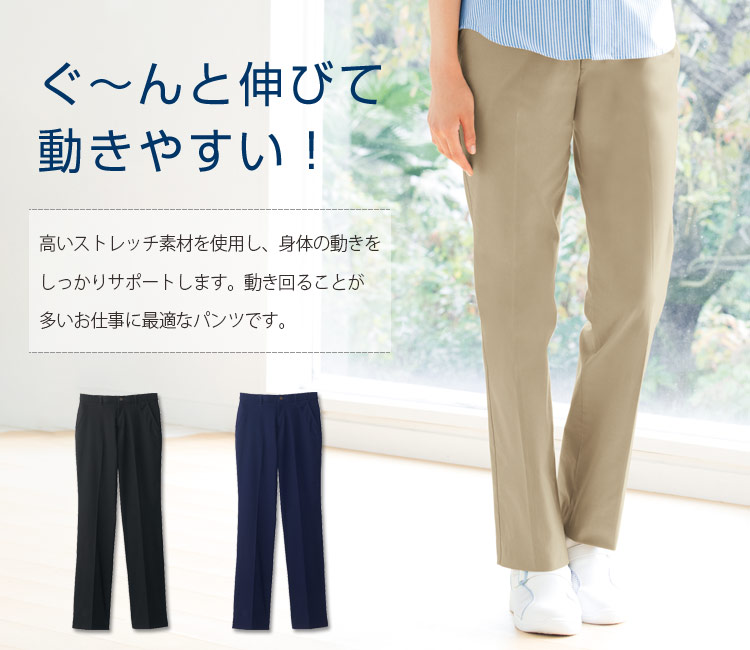 高ストレッチ性で動きやすく快適なレディースパンツ。ストレスフリーな履き心地を実感できます。コーデイネートしやすいベージュ、ブラック、ネービーの3色からお選びいただけます。