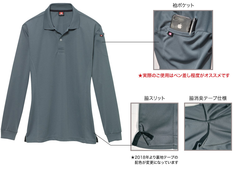 汗のベタつきを防ぐ吸汗速乾機能と不快なニオイを抑える消臭テープを脇部分に採用。作業の邪魔にならない袖ポケットも付いた、機能性抜群のアイテム。シンプルながらもおしゃれにコーディネートできるデザイン性にも優れたポロシャツです。