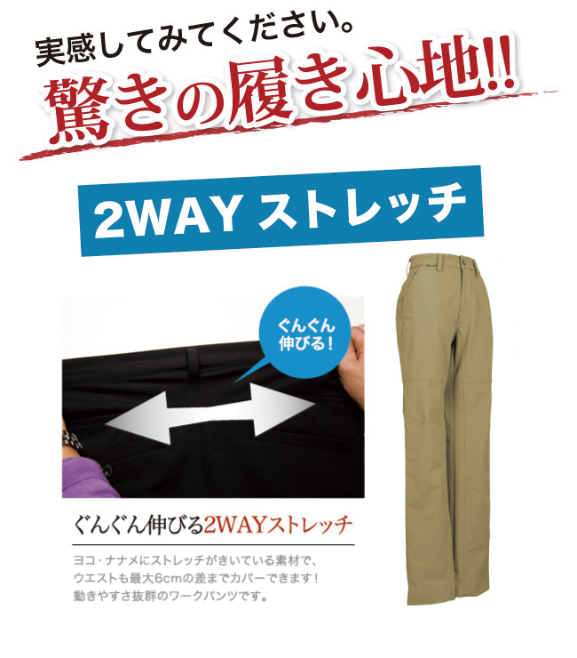 ぐんぐん伸びる2WAYストレッチでヨコ・ナナメにストレッチがきいた素材でウエストも最大6cmの差までカバーできます。