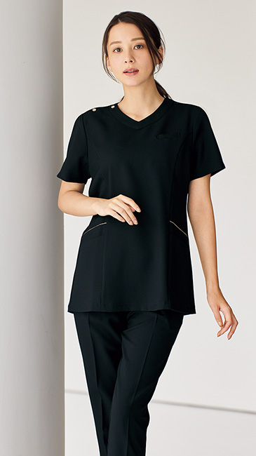 エステや美容医療、サロン、クリニックなどで働く女性におすすめのスクラブ。ゴールドラインがエレガントで上品な印象を作ります。汗をかいてもベタつきにくい吸汗速乾性に加え、ストレッチ効果で動きやすい。おしゃれで着やすいレディーススクラブです。