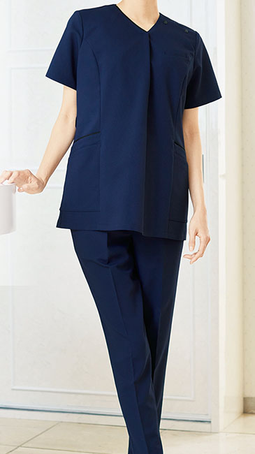エステや美容医療、サロン、クリニックなどで働く女性におすすめのスクラブ。しっかりとした耐久性とストレッチ効果で動きやすい。凛とした雰囲気が美しいスクラブです。