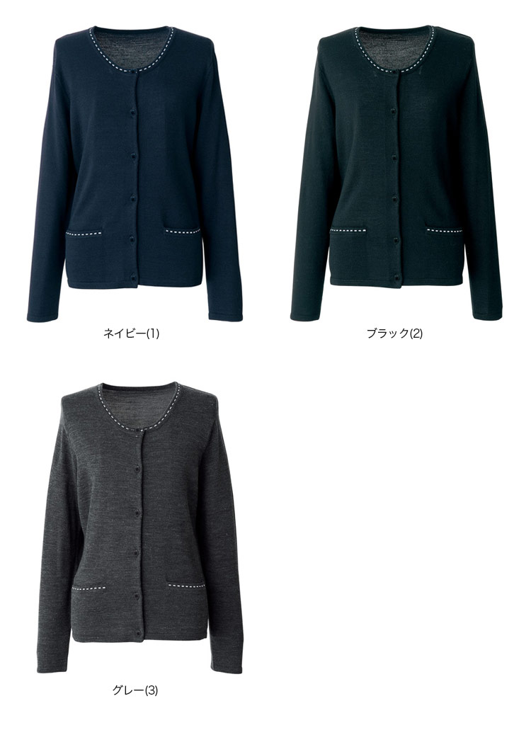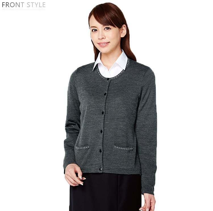顔まわりをすっきり見せる女性らしいラウンドネック。ステッチ風のラインが優しい表情のカーディガンは、受付などのおもてなしにもおすすめ。毛玉防止加工や手洗い可能なのも嬉しい。