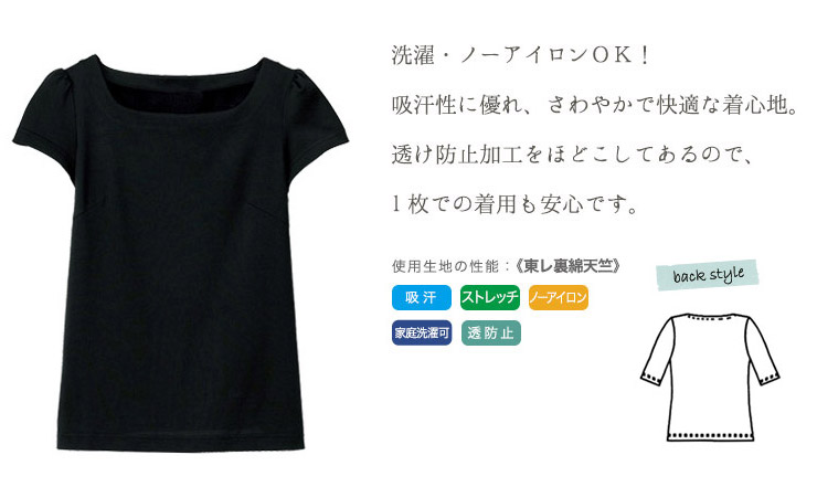 コットンのさわやかな肌ざわりとポリエステルのお手入れしやすさが調和。 吸汗性に優れ、洗濯機もOK。ノーアイロンで着用できます。 女性に安心な透け防止が加工されています。