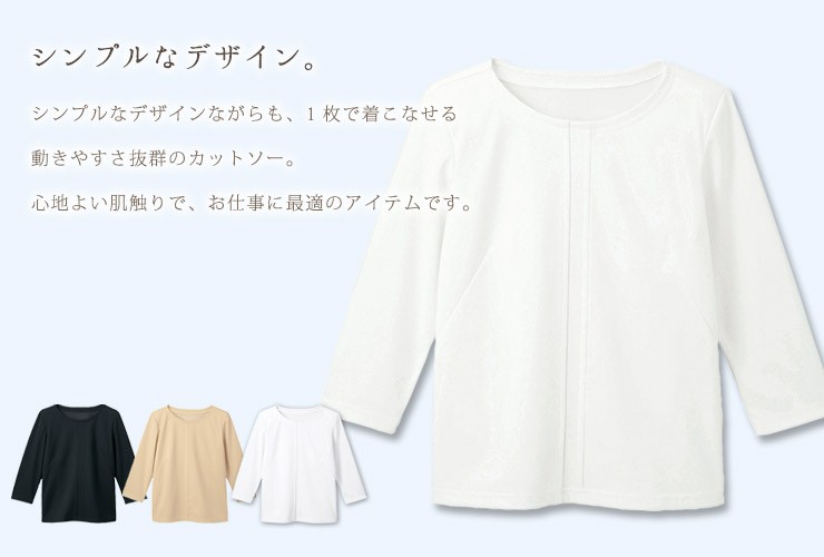 シンプルなデザインなのに、インナーでも1枚でも着られる万能カットソー。 ストレッチ性の優れた、肌触りの良い素材を使用。ノーアイロンでお手入れも簡単!