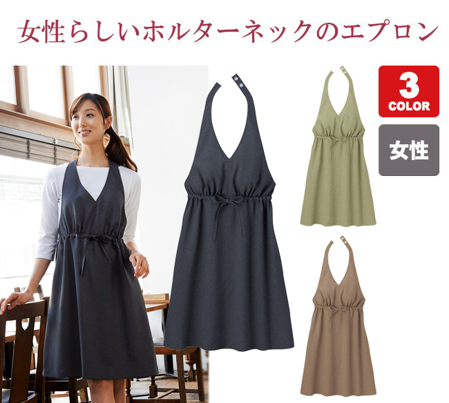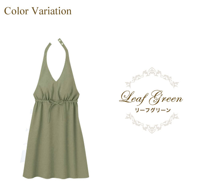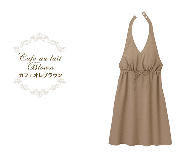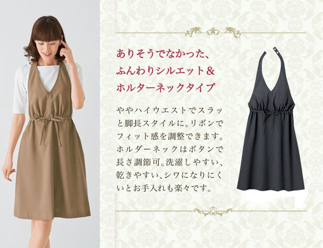 トレンド感のあるホルダーネックとふんわりスカートで、 女性らしい美しいシルエットのワンピースです。 ややハイウエストでスラッと脚長スタイルに。 リボンでフィット感を調整できます。 ホルダーネックは首の後ろの花モチーフのボタンで長さ調節ができます。 洗濯しやすい、乾きやすい、シワになりにくいとお手入れもラクラクです。