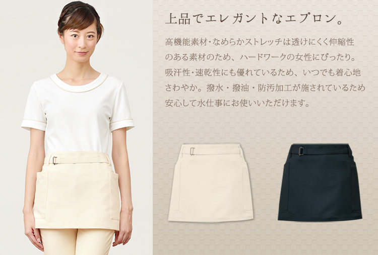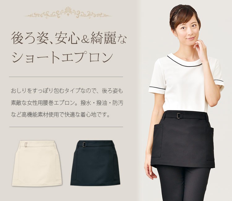 おしりをすっぽり包むタイプなので、後ろ姿も素敵な女性用腰巻エプロン。ウエストベルトはバックルに通すので邪魔にならず、高機能素材使用で快適な着心地です。撥水・撥油・防汚加工が施された高機能素材を使用したおしゃれで機能的なエプロン。