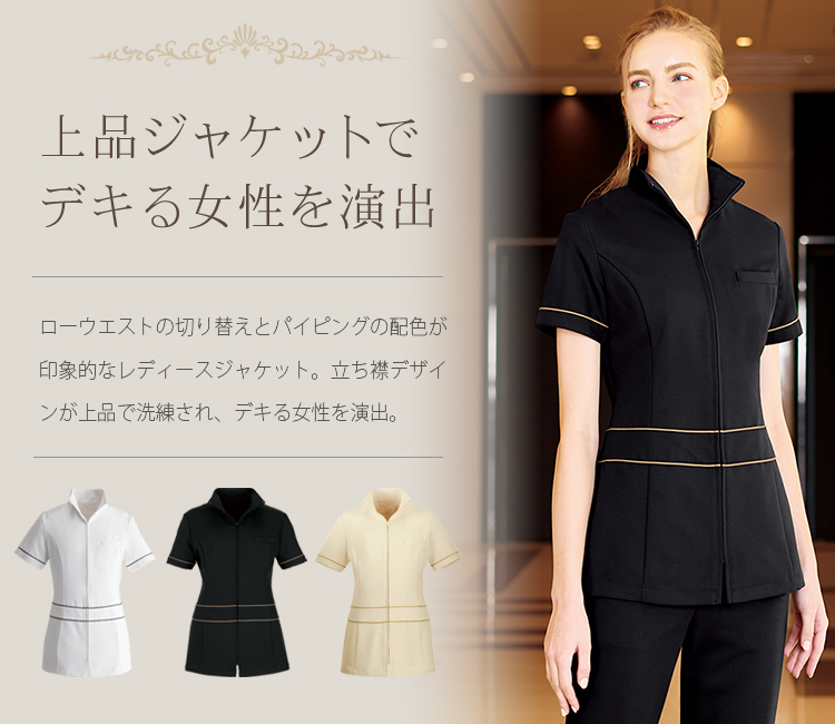 こだわりの高機能素材、なめらかストレッチを使用したハイクオリティジャケット。 ローウエストの切り替えとパイピングの配色がおしゃれ。上品で洗練されたデザインはパンツスタイルに最適。