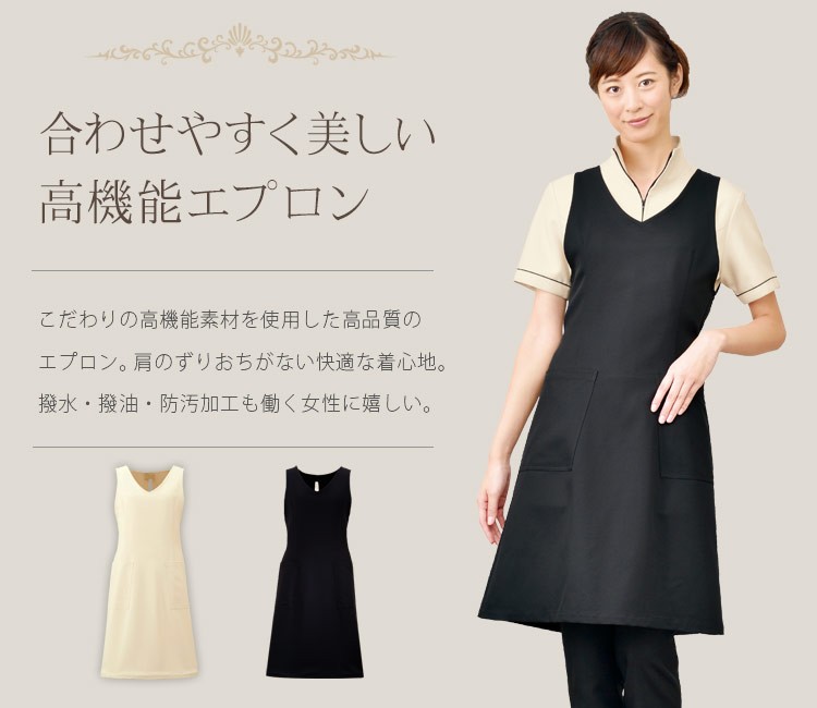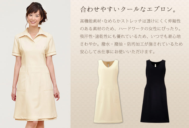 こだわりの高機能素材、なめらかストレッチを使用したハイクオリティエプロン。後ろ全体をおおい、肩のずりおちがない快適な着心地です。撥水・撥油・防汚加工が施された高機能素材を使用したおしゃれで機能的なエプロン。