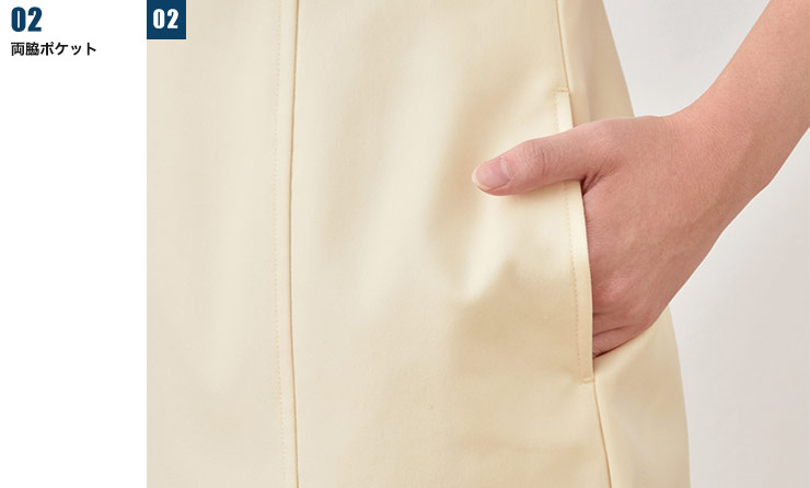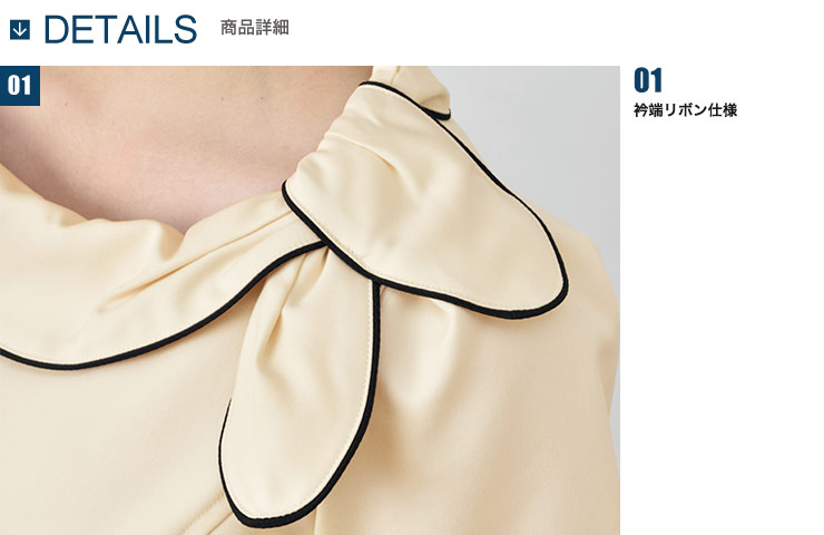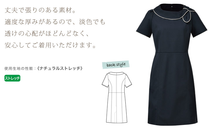 デザイナー「カミシマチナミ」が提案する、ファッショナブルなワンピース。 大きく開いた衿の端がリボンになっている、大人の女性のかわいらしさを演出した斬新なデザイン。 動き易さを重視した裾のベンツと、配色になったコードパイピングがポイント。 ポケット裏は高密度タフタでペン染みにも対応しています。