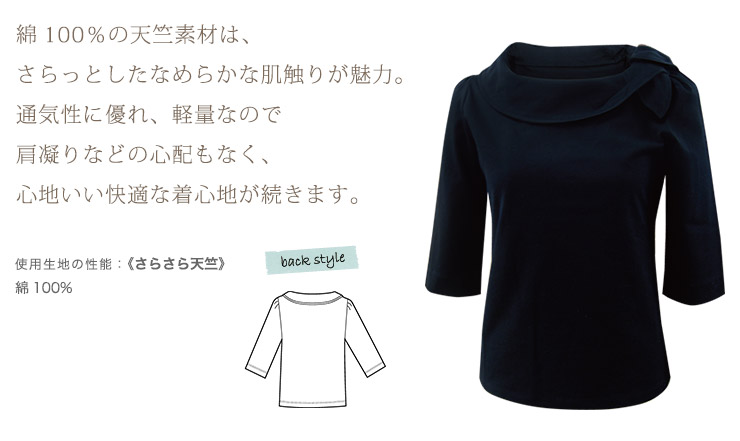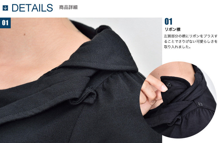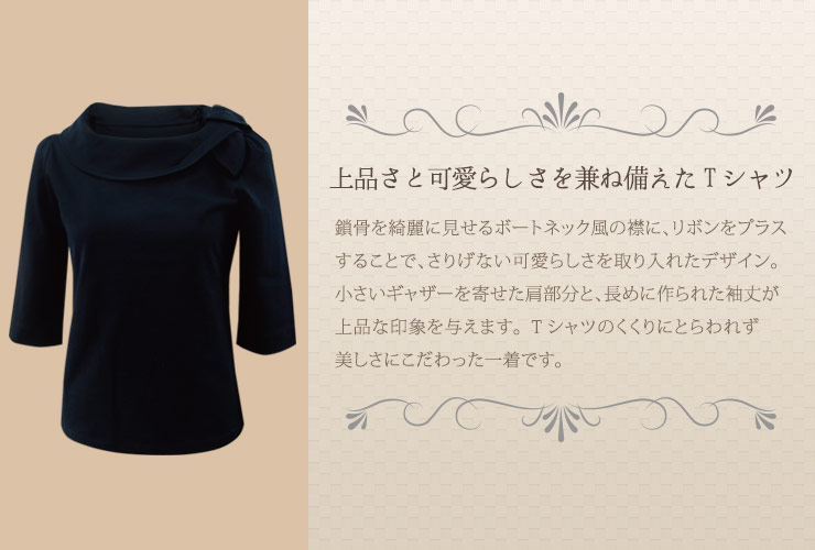 ボートネック風に開いた襟と恥のリボンの可愛らしさが特徴。