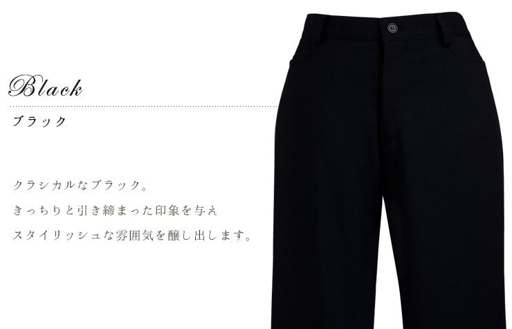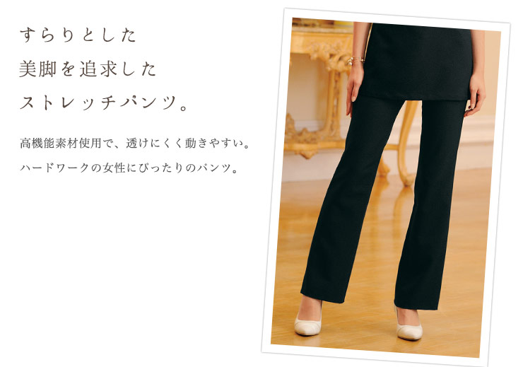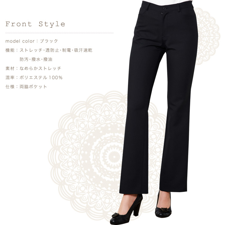 美脚を追求したストレッチパンツ。 柔らかく、なめらかな素材を使用。裾までのラインがすらりと美脚に見せてくれるブーツカットシルエット。 防透け効果がある素材なので、下着透けの不安も軽減されます。