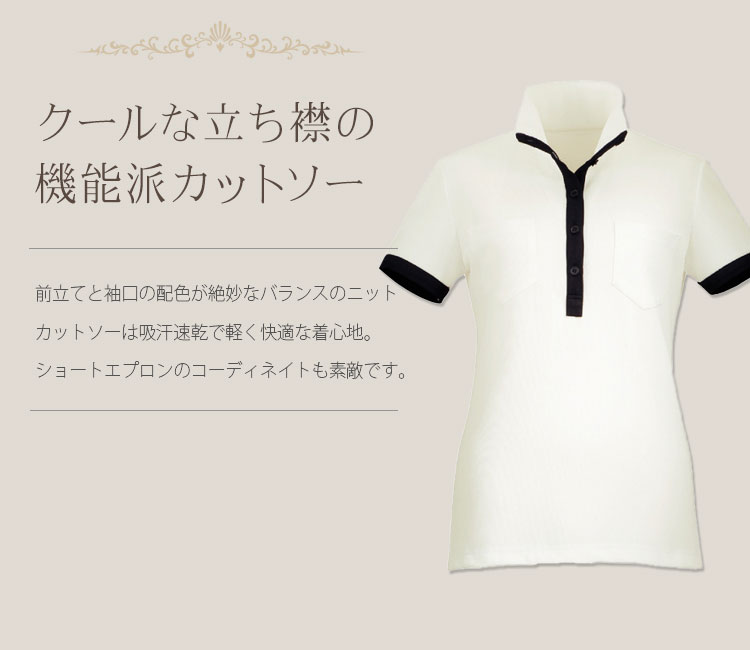 立ち衿がクールなカットソー。 前たてと袖口の配色が絶妙なバランスです。ニット素材なので快適な着心地。 ショートエプロンをコーディネイトしても素敵です。