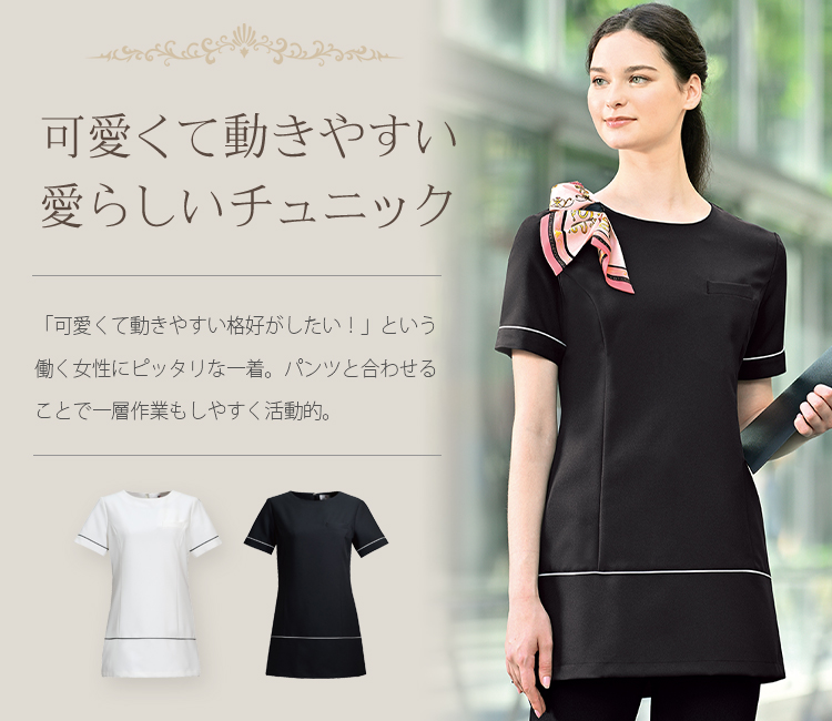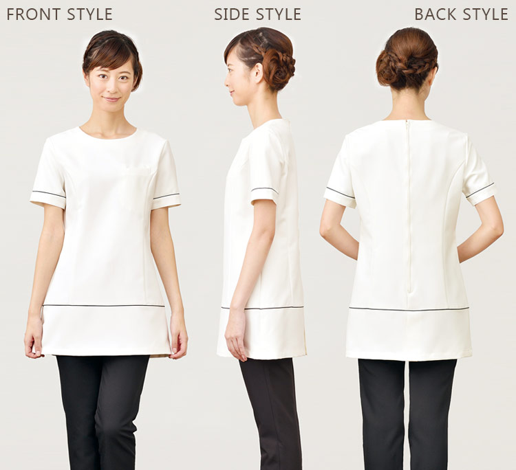 袖口と裾にパイピングを施した愛らしいチュニック。パンツを合わせる事で作業もしやすく活動的。「可愛く動きやすい格好がしたい!」という働く女性にピッタリな一着です。