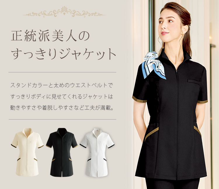 こだわりの高機能素材、なめらかストレッチを使用したハイクオリティジャケット。 スタンドカラーや太めのウエストベルトがスタイルを良く見せ、パイピングの配色がおしゃれ。上品で洗練されたデザインはパンツスタイルに最適。