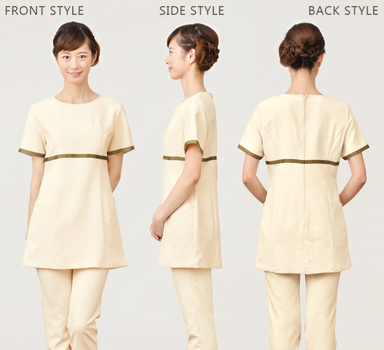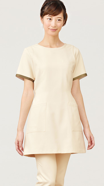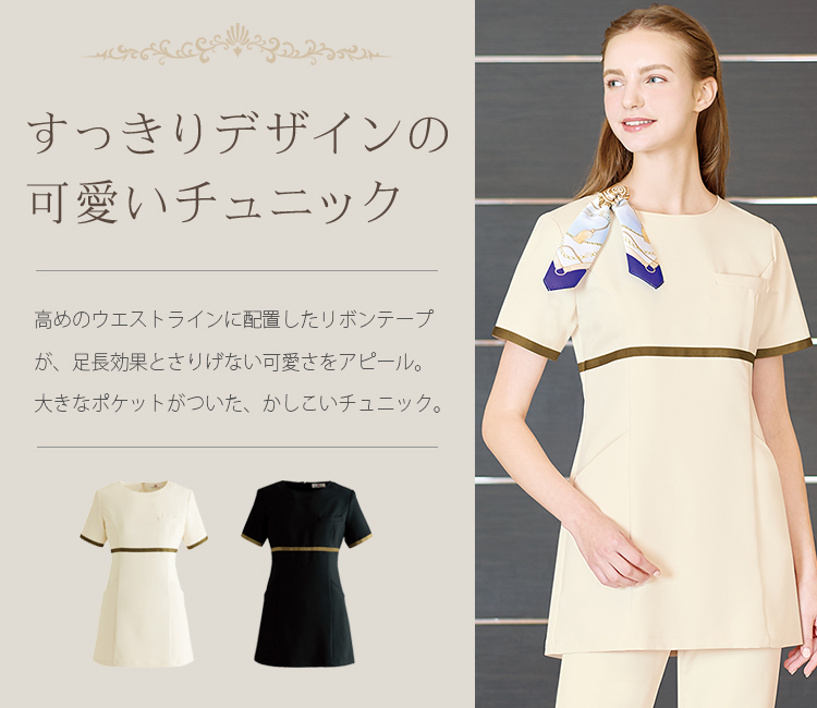 こだわりの高機能素材、なめらかストレッチを使用したハイクオリティチュニック。 すっきりシルエットで着る人のシルエットをさらに美しく。配色のリボンテープがさりげなく可愛さをアピール。