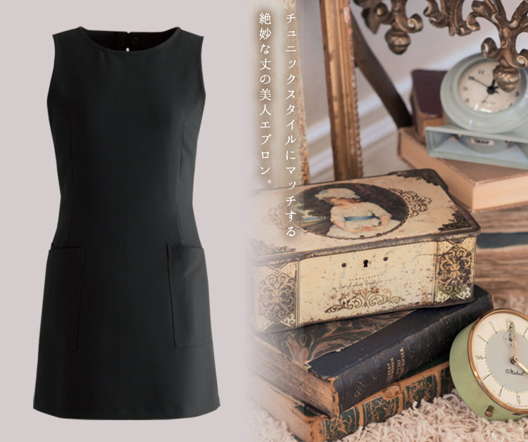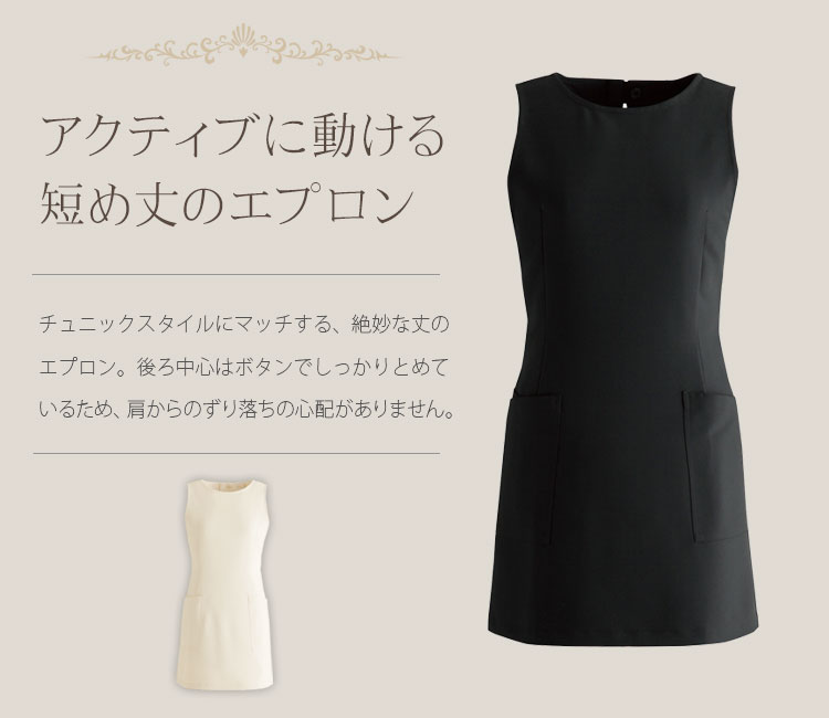 チュニックスタイルにマッチする、絶妙な丈のおしゃれなエプロン。 後ろ中心はボタンでしっかりとめているため、肩ひもタイプとは違い、肩からのずり落ちの心配がありません。