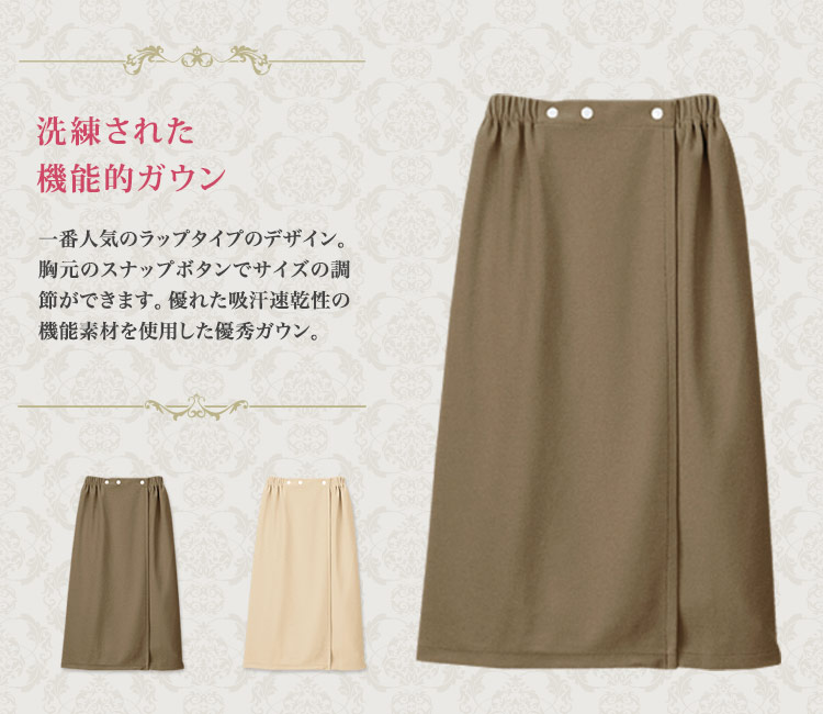 洗練された機能的ガウン。人気のラップタイプのデザインで、胸元のスナップボタンでサイズ調整ができます。