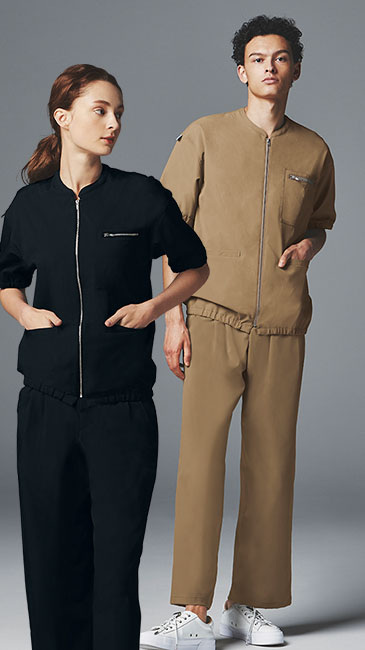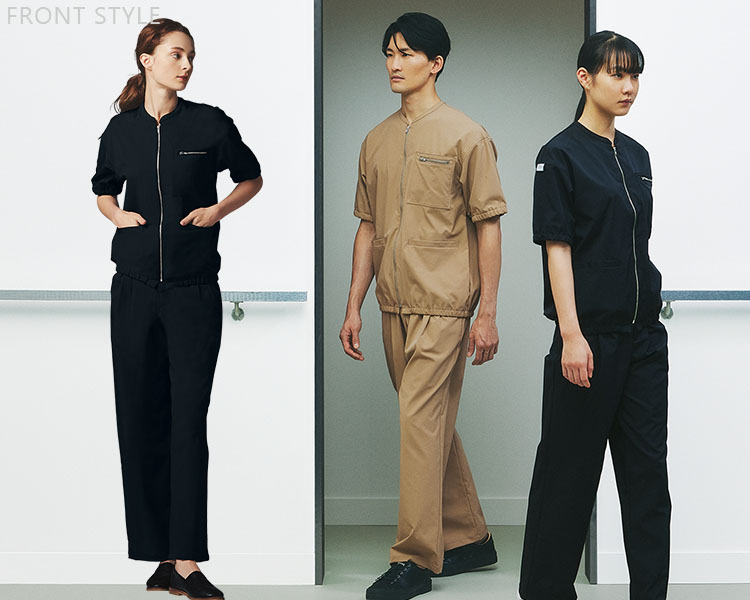 - フロントファスナーあき、左胸ポケット(ペン差しループ付) 、両脇ポケット、袖口ゴム、裾ゴム