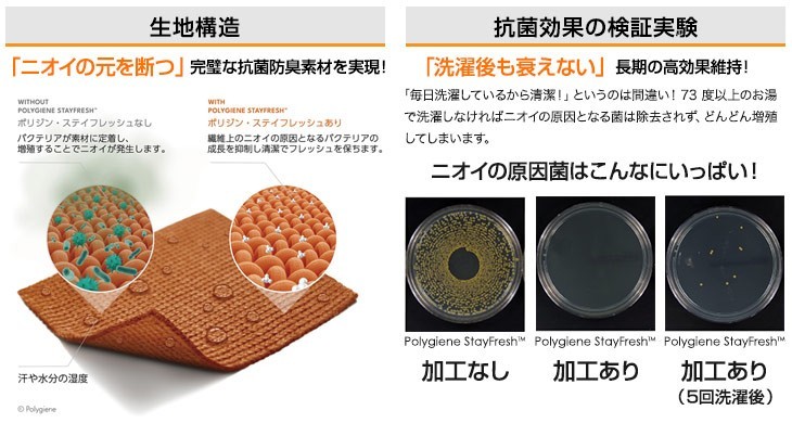 「ポリジン・ステイフレッシュ」は、スウェーデンのPolygiene®社で開発された、天然の銀イオンにより微生物やバクテリアの繁殖を抑制する、抗菌・防臭加工技術です。ニオイの原因となるバクテリアの増殖を抑え、24 時間以内に99% 以上抗菌します。
