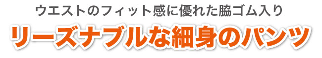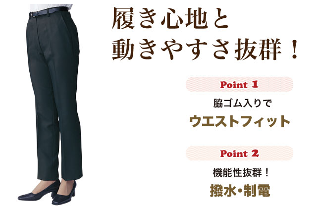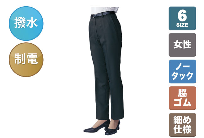 細め仕様、撥水、制電、脇ゴムレディースパンツ。