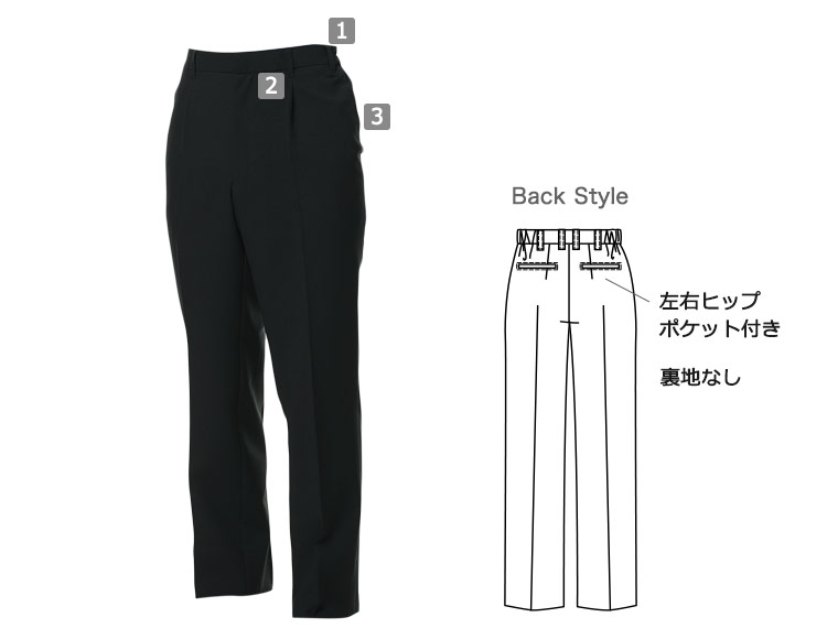 - 両脇ポケット、左右ヒップポケット、前ファスナー付き、裏地なし