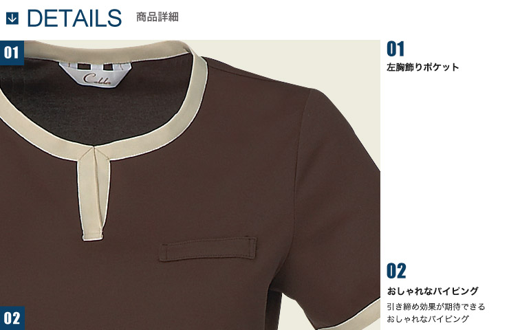 襟元・袖口・裾のおしゃれなパイピングが体を引き締めて見せます。