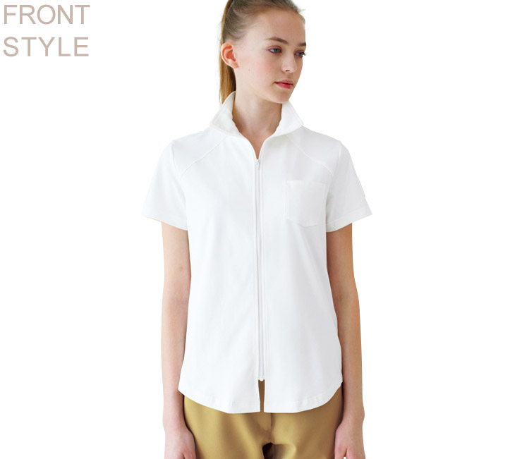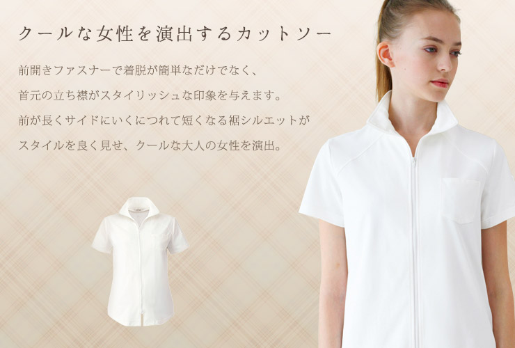 首元の立ち襟がスタイリッシュな印象を与え、裾のシルエットがスタイルを良く見せます。