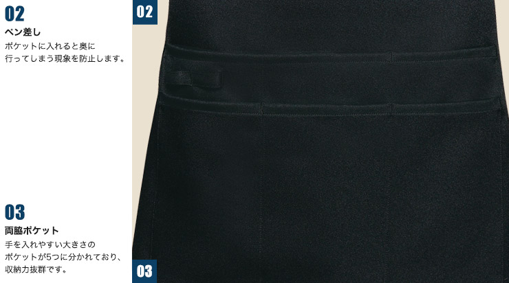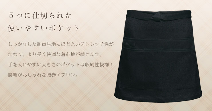 5つに仕切られた使いやすいポケットが特徴的な腰巻エプロン。