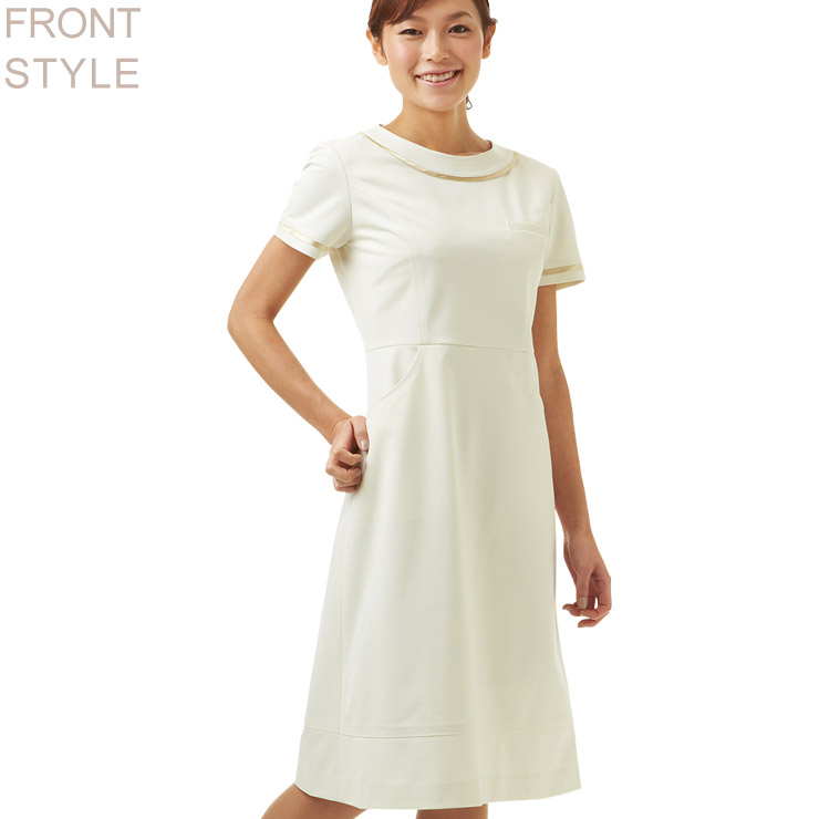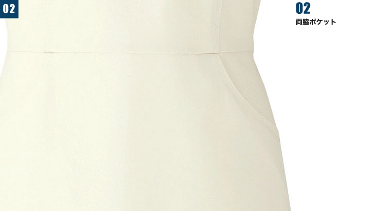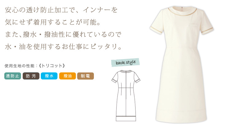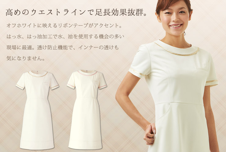 オフホワイトに映えるリボンテープがアクセント。はっ水、はっ油加工で水、油を使用する機会の多い現場に最適。