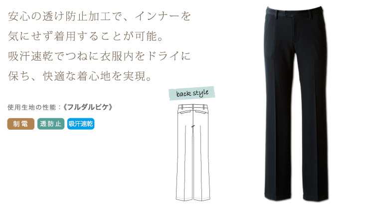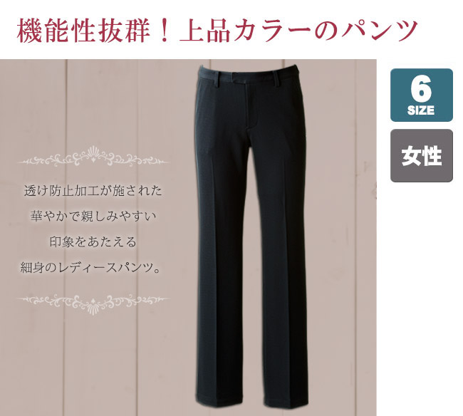 透け防止加工が施された、華やかで親しみやすい印象をあたえる細身のレディースパンツ。 吸汗速乾機能も備えているため、衣服内をつねにドライに保ち、快適な着心地を実現。