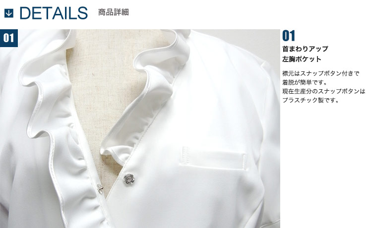 光沢のあるライン入りのフリルが華やかな印象を演出。胸元はだけを防止するスナップボタン付き。